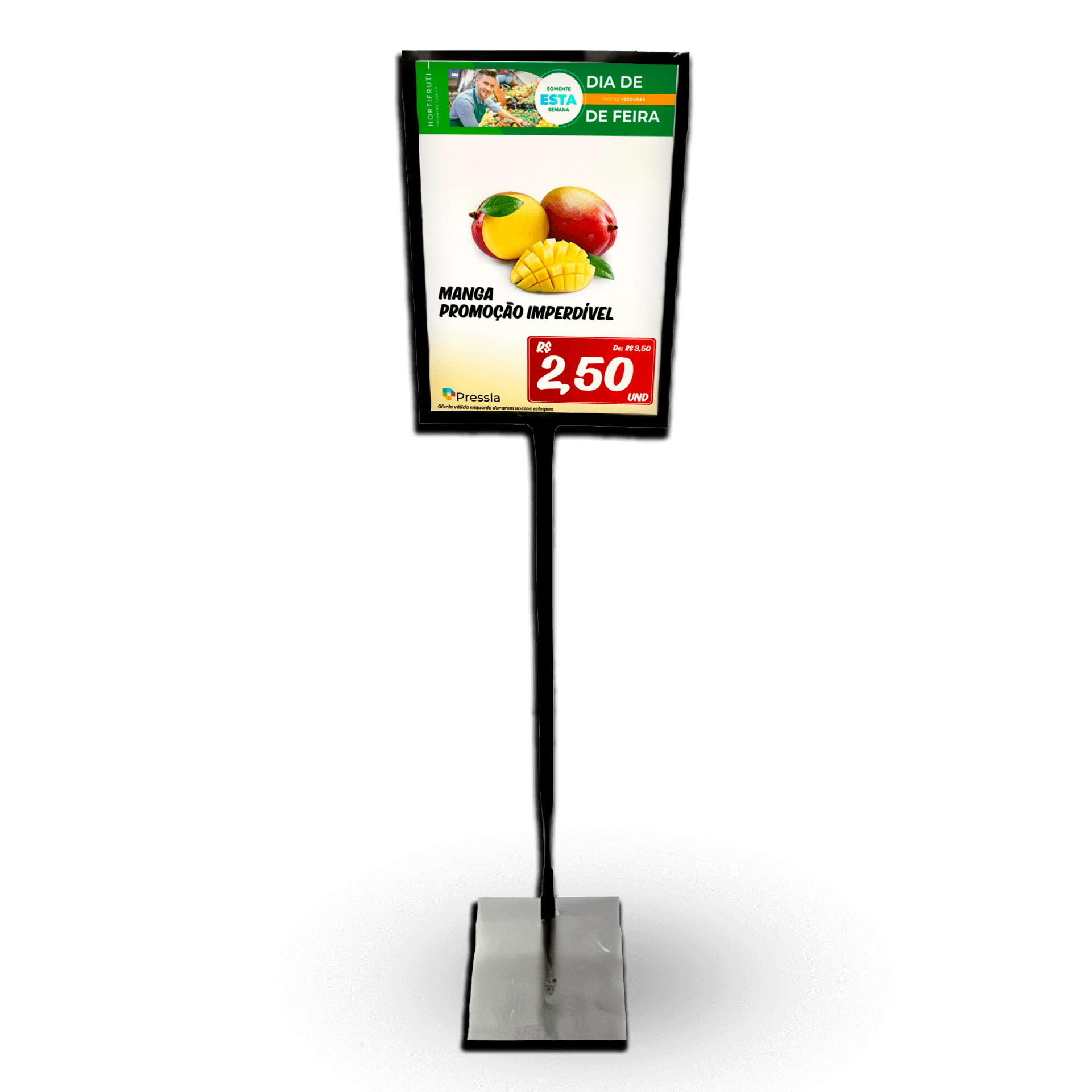 Aumente a visibilidade das suas promoções e informações com o Pedestal Display Metálico A3 sem regulagem de altura. Ideal para supermercados, lojas de varejo e diversos ambientes comerciais, este pedestal oferece uma solução prática e elegante para a comunicação visual do seu estabelecimento.